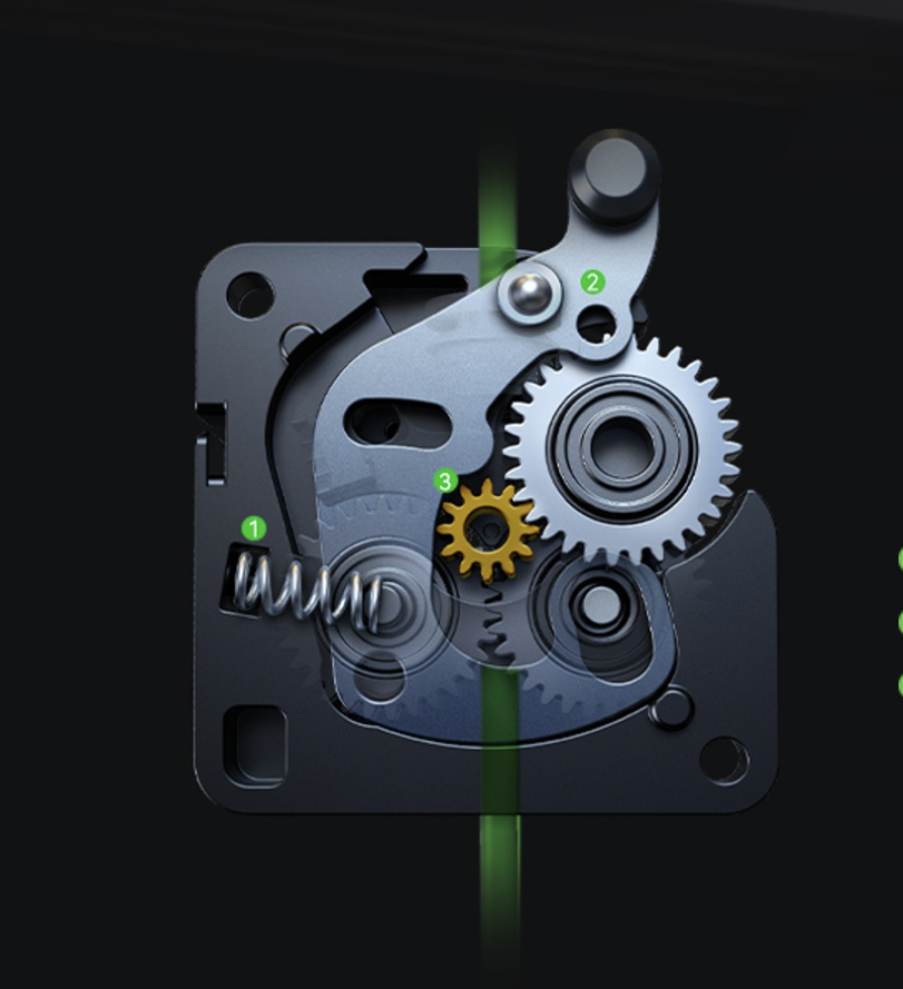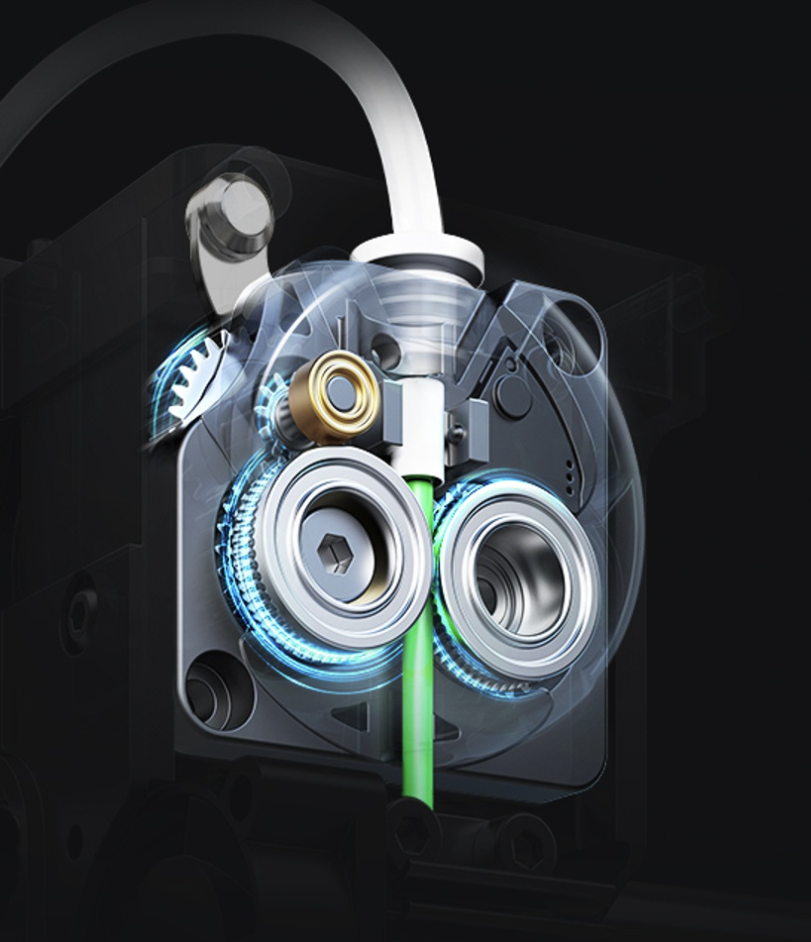 Direct drive extruder tiskárny Ender-3 V3 Plus je vylepšen o podporovou pružinu a kuličkový píst. Pevně drží filament bez prokluzování.