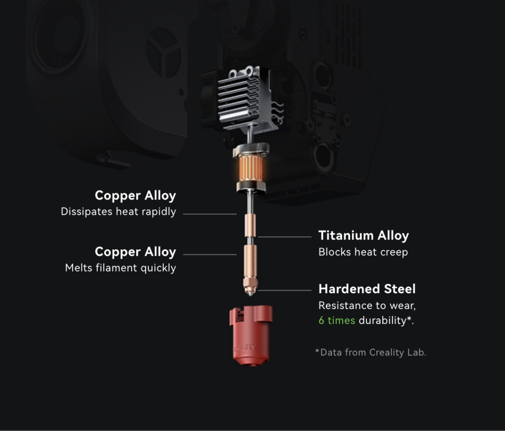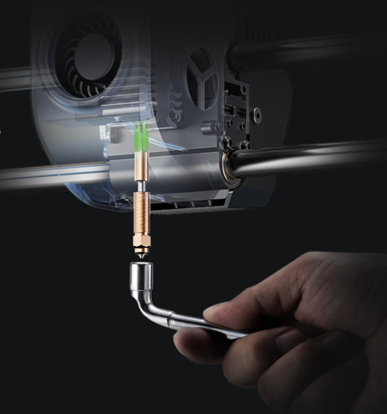 - Sada trysek: Rychlovýměnná tryska (s tvrdou ocelí) integrovaná s heatbreakem