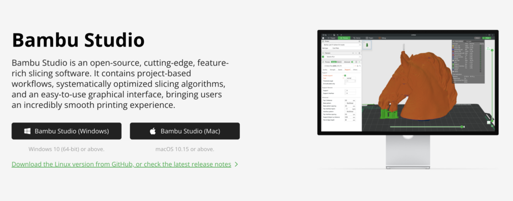 Windows 10 (64-bit) nebo novější MacOS 10.15 nebo novější Pro Linux poskytují AppImage a návod, jak zkompilovat pro Ubuntu a Fedora Linux. Ačkoliv to začalo jako aktivita komunity, Bambu Lab to převzalo a přidalo do svých oficiálních vydání na GitHubu.