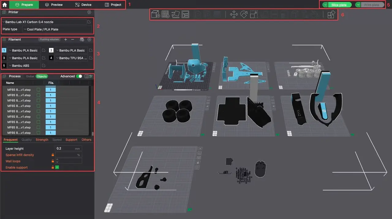 Pohled na UI Bambu Studia UI rozložení Bambu Studia je velmi snadno pochopitelné a naučit se. Nabízí moderní uživatelské prostředí, a jeden může rychle přejít od začátečníka k expertovi na tomto sliceru s trochou praxe. Zde je přehled UI Bambu Sliceru: