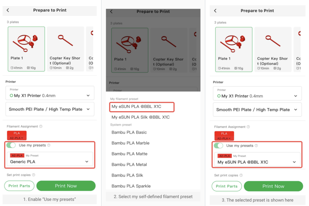 Navíc, jako pokročilou funkci, Bambu Handy podporuje výběr vlastních přednastavení filamentu, která definujete v Bambu Studio. To vám umožní dosáhnout optimálních výsledků tisku, zejména pro filamenty, které nejsou přednastavené v Bambu Studio.