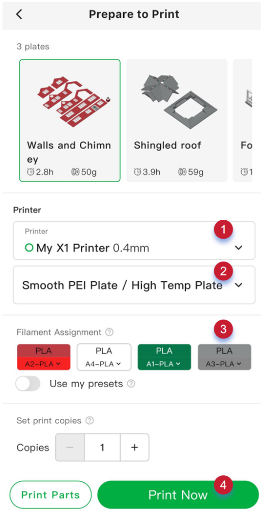 - Pokud je nainstalován AMS: Aplikace Bambu Handy automaticky přiřadí slot AMS (A1~A4) pro požadovaný filament podle typu a barvy materiálu, který je použit pro aktuální tiskovou úlohu. Můžete jej také změnit podle potřeby.