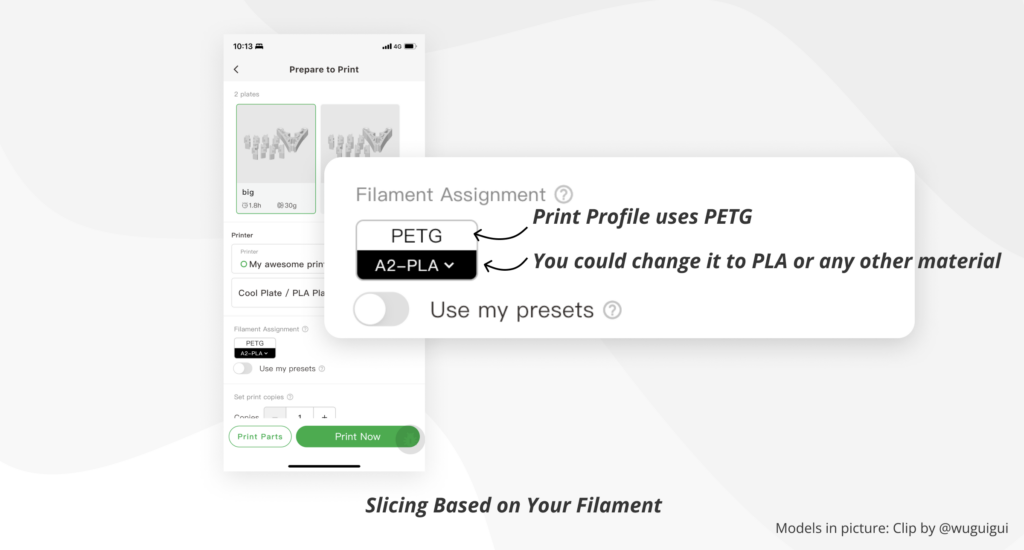 Když nemáte stejný materiál, který byl použit v tiskovém profilu, nezoufejte. Můžete vybrat vhodnou náhradu z materiálů, které máte k dispozici. Například pokud byl použit PETG, můžete zvolit PLA, ABS nebo jakýkoli jiný materiál. Naše cloudové řezací služby se přizpůsobí zvoleným parametrům materiálu, aby zajistily přesný tisk.