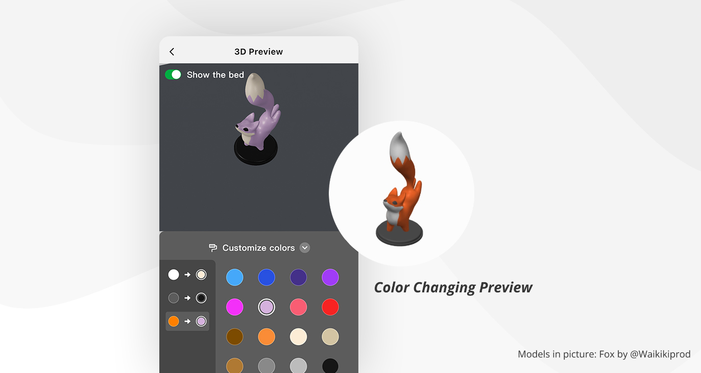 Tato funkce poskytuje jasnou vizualizaci toho, jak bude váš tisk vypadat s vybranými barvami. Kromě toho cloudové řezání upravuje množství vyplachování filamentu, aby zabránilo míchání barev na základě vašich barevných výběrů.