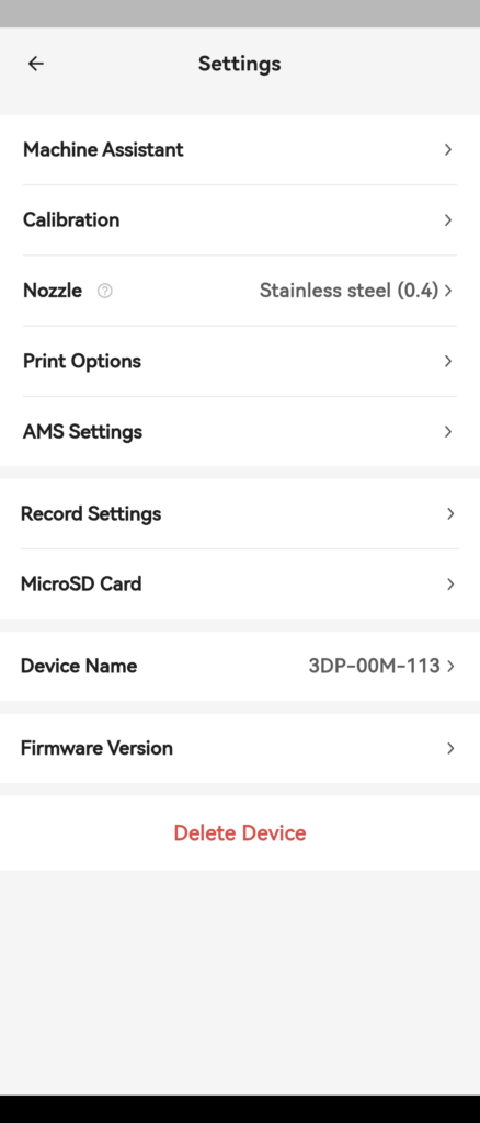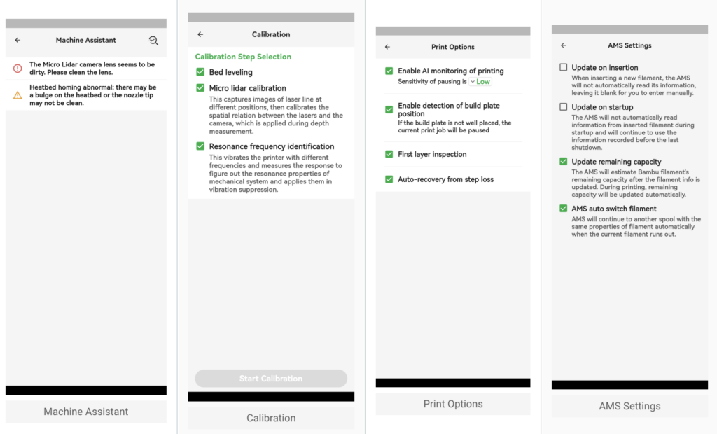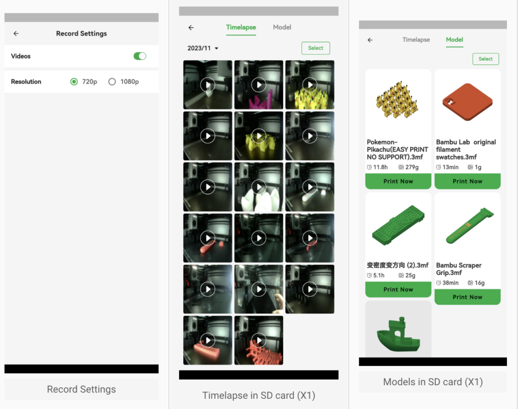 Tato možnost upravuje nastavení videozáznamu během tisku. Řada X1 zde může vybrat rozlišení videozáznamu a všechny tiskárny zde mohou zapnout nebo vypnout funkci videozáznamu.