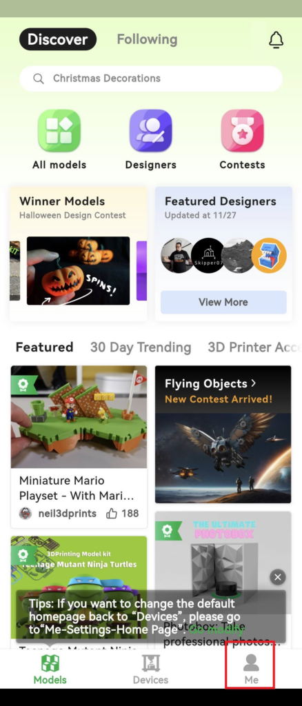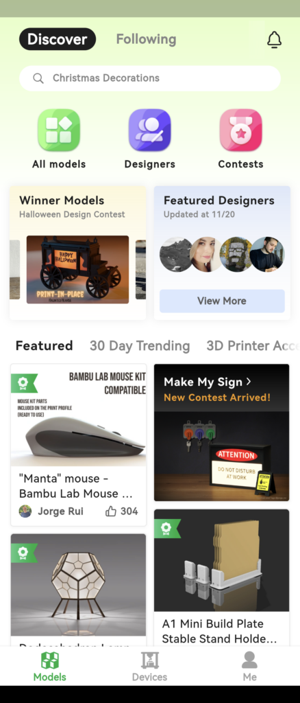 V levém horním rohu této obrazovky jsou dvě hlavní karty. Karta „Objevovat“ je místo, kde si můžete prohlížet modely a designéry, a karta „Sledováno“ vám umožní zkontrolovat nejnovější příspěvky od designérů, které sledujete.