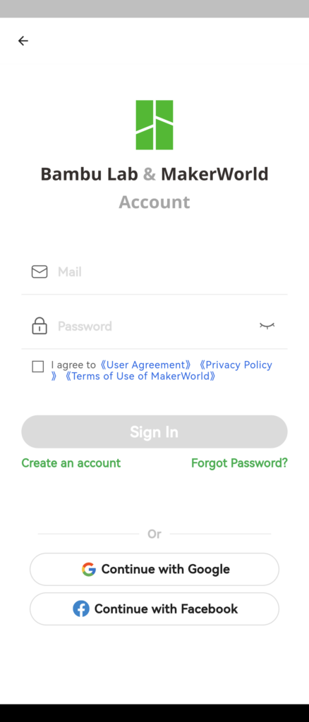 Bambu Handy nabízí možnosti přihlášení pomocí e-mailové adresy, účtu Google nebo účtu Facebook.