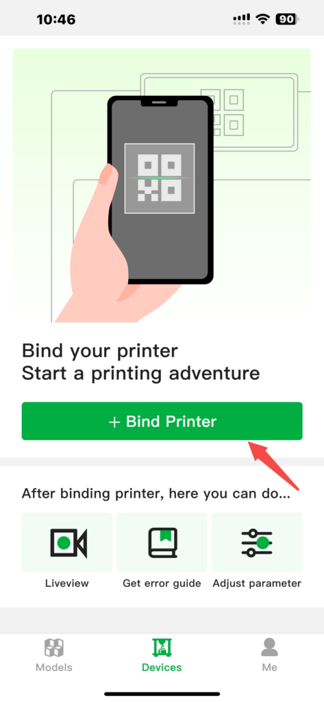 Po úspěšném přihlášení do svého účtu klepněte na tlačítko Devices (Zařízení) v dolní navigační liště, abyste se dostali na stránku „Zařízení“, a poté klikněte na Bind Printer (Připojit tiskárnu), abyste přidali tiskárnu.