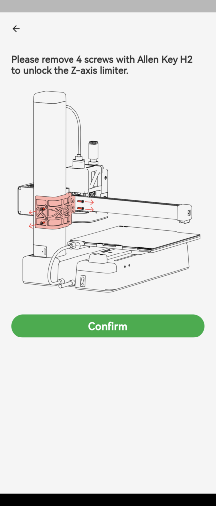 Po dokončení procesu propojení, pokud používáte 3D tiskárnu poprvé, budete možná muset podle pokynů v aplikaci odstranit všechny ochranné části, které byly na tiskárně nainstalovány během přepravy. Pokud už tiskárnu znáte a používali jste ji dříve, tento krok můžete přeskočit kliknutím na Potvrdit.