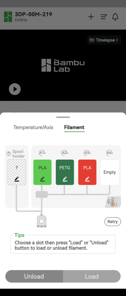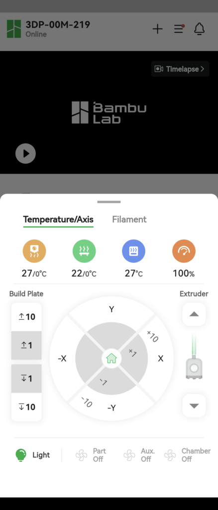 Kliknutím na Tiskárna nebo AMS na levé straně modulu přejdete na detailní stránku, kde kromě funkcí dostupných na hlavní obrazovce můžete pohybovat osami tiskárny, ovládat některé části (například světlo a chladicí ventilátor) a ovládat AMS pro provádění akcí načítání/vykládání filamentu.