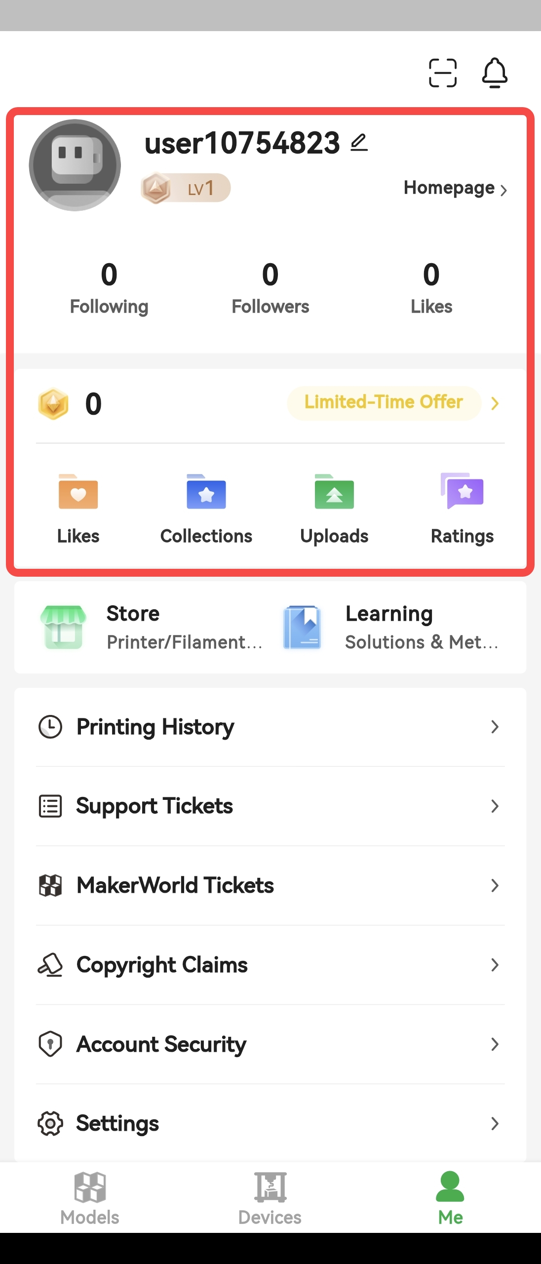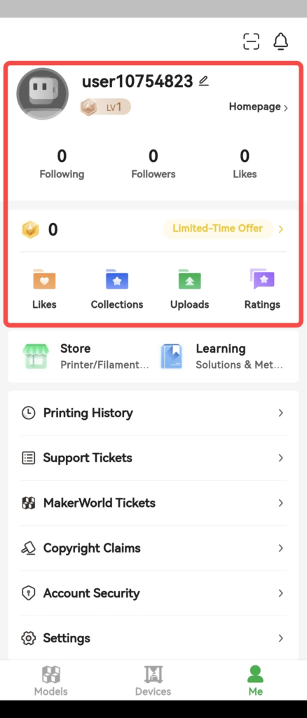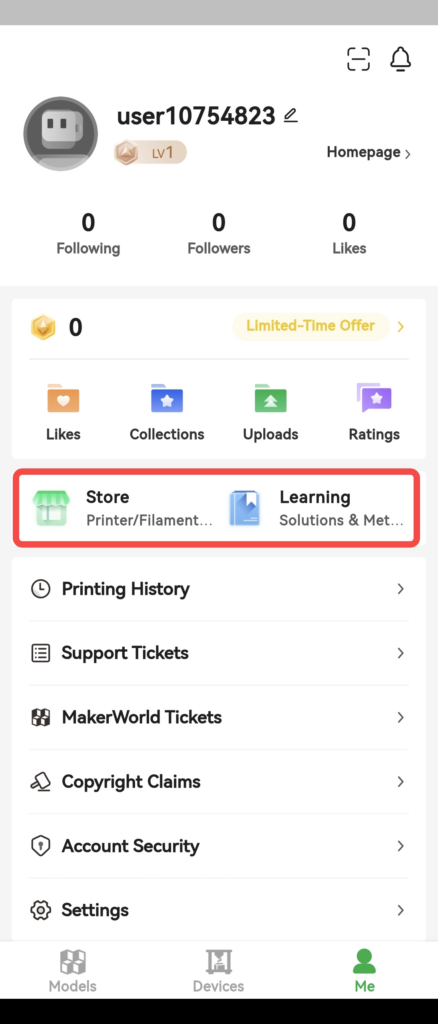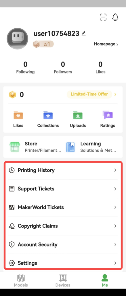 • Podpůrné a MakerWorld tikety: Tyto dvě možnosti slouží ke správě tiketů podpory v rámci vašeho účtu. Tikety slouží Bambu Labu k monitorování problémů uživatelů. V těchto menu můžete spravovat existující tikety a nahrávat záznamy tiskárny během problémového období, což usnadňuje řešení problémů s tiskem.