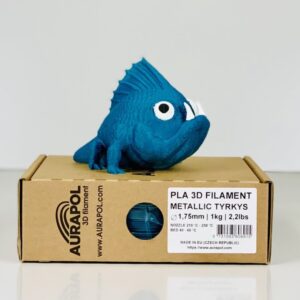 - Metalická tyrkysová PLA struna od Aurapolu pro 3D tisk s průměrem 1,75 mm. Balení obsahuje 1 kg filamentu. PLA je biologicky odbouratelný materiál na bázi kukuřičného škrobu. Doporučená teplota tisku je 190–220 °C, teplota podložky 50–60 °C (není nutná). Vhodné pro tisk dekorací, prototypů a modelů.
