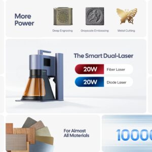 Dvojitý laserový systém: 20W modrý diodový laser (450 nm) a 20W vláknový laser (1064 nm) umožňují gravírování a řezání různých materiálů s vysokou přesností.